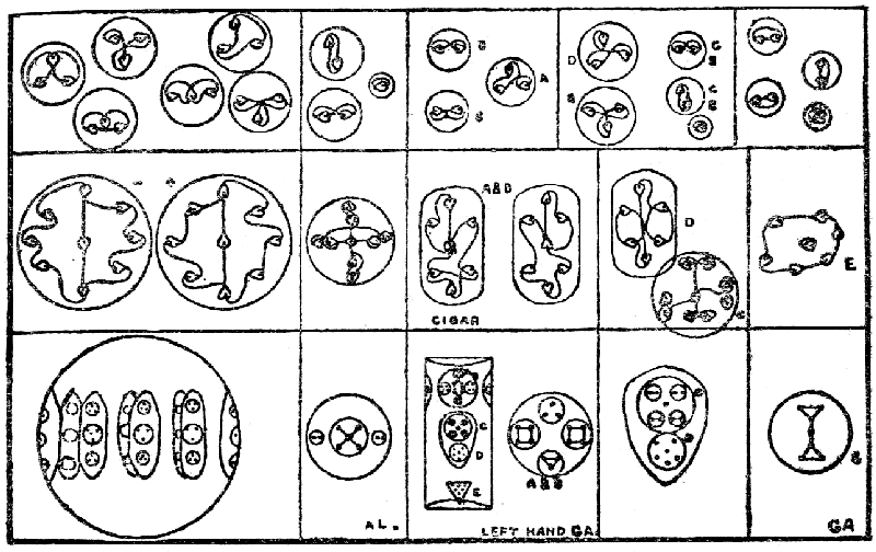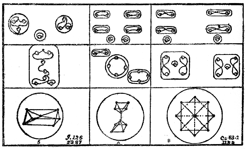 The ultimate atom, which is the same in all the observed cases, is an exceedingly complex body, and only its main characteristics are given in the diagram. It is composed entirely of spirals, the spiral being in its turn composed of spirillæ, and these again of minuter spirillæ. A fairly accurate drawing is given in Babbitt's "Principles of Light and Colour," p. 102. The illustrations there given of atomic combinations are entirely wrong and misleading, but if the stove-pipe run through the centre of the single atom be removed, the picture may be taken as correct, and will give some idea of the complexity of this fundamental unit of the physical universe.