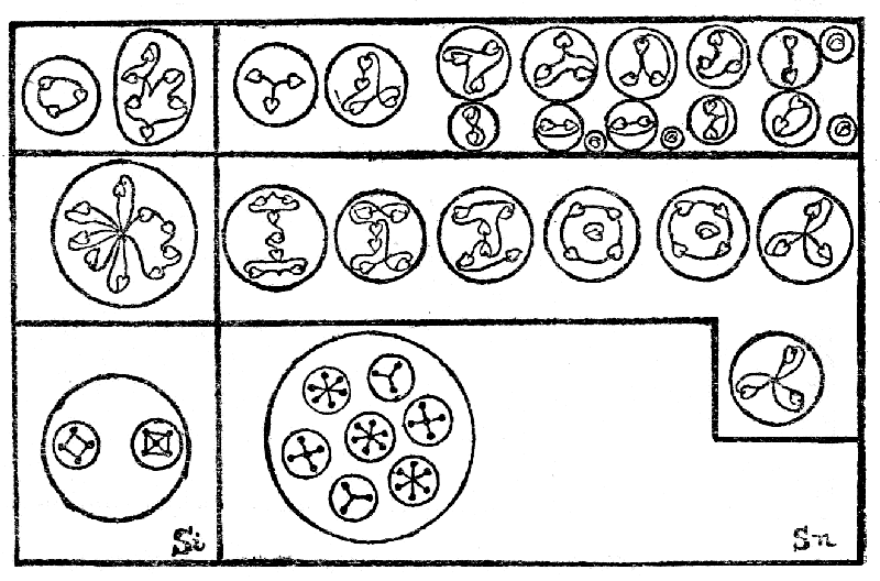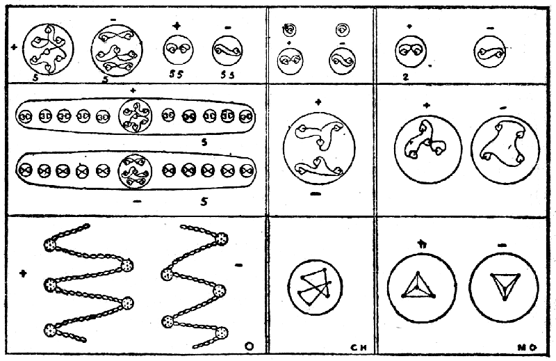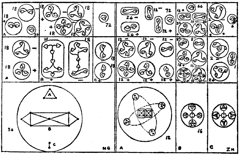 Some other observations were made which went to show that as weight-numbers increased, there was a corresponding increase in the number of bodies discerned within the chemical atom; thus, gold showed forty-seven contained bodies; but these observations need repetition and checking. Investigation of a molecule of water revealed the presence of twelve bodies from hydrogen and the characteristic snake of oxygen, the encircling walls of the chemical atoms being broken away. But here again, further observations are necessary to substantiate details. The present paper is only offered as a suggestion of an inviting line of research, promising interesting results of a scientific character; the observations recorded have been repeated several times and are not the work of a single investigator, and they are believed to be correct so far as they go.