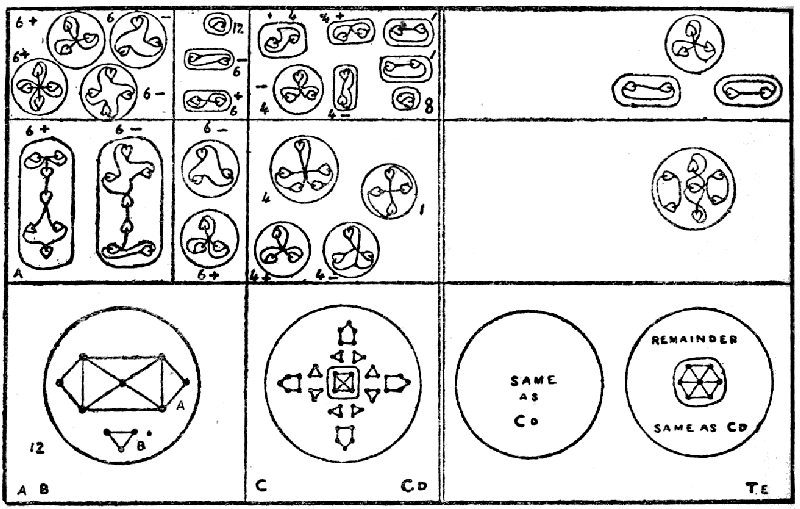 The wall of the limiting spheroid in which the bodies are enclosed being composed of the matter of the third, or gaseous, kind, drops away when the gaseous atom is raised to the next level, and the six bodies are set free. They at once re-arrange themselves in two triangles, each enclosed by a limiting sphere; the two marked b in the diagram unite with one of those marked b' to form a body which shows a positive character, the remaining three forming a second body negative in type. These form the hydrogen particles of the lowest plane of ether, marked E 4—ether 4—on the diagram. On raising these further, they undergo another disintegration, losing their limiting walls; the positive body of E 4, on losing its wall, becomes two bodies, one consisting of the two particles, marked b, distinguishable by the linear arrangement of the contained ultimate atoms, enclosed in a wall, and the other being the third body enclosed in E 4 and now set free. The negative body of E 4 similarly, on losing its wall, becomes two bodies, one consisting of the two particles marked b', and the second the remaining body, being set free. These free bodies do not remain on E 3 but pass immediately to E 2, leaving the positive and negative bodies, each containing two particles, as the representatives of hydrogen on E 3. On taking these bodies a step higher their wall disappears, and the internal bodies are set free, those containing the atoms arranged lineally being positive, and those with the triangular arrangement being negative. These two forms represent hydrogen on E 2, but similar bodies of this state of matter are found entering into other combinations, as may be seen by referring to f on E 2 of nitrogen (N). On raising these bodies yet one step further, the falling away of the walls sets the contained atoms free, and we reach the ultimate physical atom, the matter of E 1. The disintegration of this sets free particles of astral matter, so that we have reached in this the limit of physical matter. The Theosophical reader will notice with interest that we can thus observe seven distinct substates of physical matter, and no more.