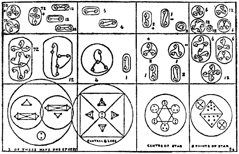 In counting the number of ultimate atoms in a chemical elemental atom, we did not count them throughout, one by one; when, for instance, we counted up the ultimate atoms in sodium, we dictated the number in each convenient group to Mr. Jinarâjadâsa, and he multiplied out the total, divided by 18, and announced the result. Thus: sodium (see Plate I) is composed of an upper part, divisible into a globe and 12 funnels; a lower part, similarly divided; and a connecting rod. We counted the number in the upper part: globe—10; the number in two or three of the funnels—each 16; the number of funnels—12; the same for the lower part; in the connecting rod—14. Mr. Jinarâjadâsa reckoned: 10 + (16 x 12) = 202; hence: 202 + 202 + 14 = 418: divided by 18 = 23.22 recurring. By this method we guarded our counting from any prepossession, as it was impossible for us to know how the various numbers would result on addition, multiplication and division, and the exciting moment came when we waited to see if our results endorsed or approached any accepted weight. In the heavier elements, such as gold, with 3546 atoms, it would have been impossible to count each atom without quite unnecessary waste of time, when making a preliminary investigation. Later, it may be worth while to count each division separately, as in some we noticed that two groups, at first sight alike, differed by 1 or 2 atoms, and some very slight errors may, in this way, have crept into our calculations.
