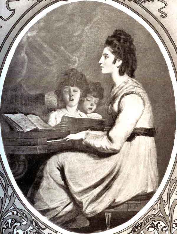 Lady Bingham was careful of the education and company of her daughters. The girls were musical, and Lavinia excelled in painting as well. Walpole writes of her being in Italy, in 1785, with Mrs. Damer, his sculptor friend, and of her drawing with very great expression. He was not so complimentary of her music some years before, when he tells of being invited to Lady Lucan's to hear her daughters sing Jomelli's [80]"Miserere," set for two voices: "It lasted for two hours, and instead of being pathetic was eminently dull, until at last I rejoiced when 'the two women had left the sepulchre.'"