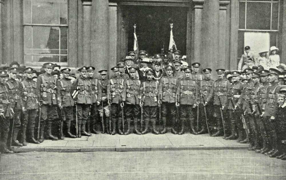 It did not demand much wit to foretell that sooner or later we should be asked to offer ourselves for service abroad. The question was put for the first time on the 13th of August, at Duffield. A rough estimate was made that at least 70 per cent. would consent gladly and without further thought, and of the others hesitation was caused in many cases because men wondered whether in view of their positions in civil life they had the right to answer for themselves. It should be understood that a very large number were skilled men, and had joined the home army merely because they thought it a good thing to do. And because they liked it, and knew it was a good thing to do, they were content to accept humble places in a force formed for home service[Pg 4] and home defence only. Also, at that stage it was not perfectly certain that everyone would be wanted, and when the question of war service abroad was raised, and other men were not serving at all, it is only natural that the thought passed through some men's minds that the appeal was not for them. We think that the battalion might be congratulated upon the general spirit of willingness shown, especially as in the 17th August when the question was put again more definitely, the percentage of those ready to extend the terms of service was estimated at 90.