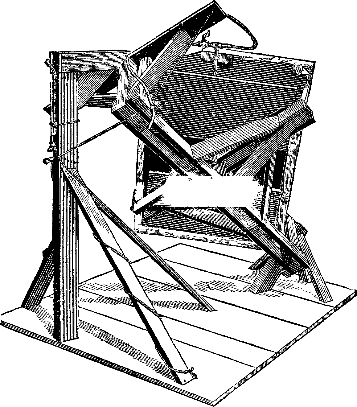 To put the apparatus in operation, the acid cock, c, is opened and the wheel, A, is turned, thus setting in motion both the pump piston, P, and the agitator, within S and D. Then the play of the pump produces a suction in the washers and from thence in the generator and causes the acid in the vessel, C, to flow into the generator through the leaden siphon tubes, c. Coming in contact with the chalk in suspension, the acid produces a disengagement of gas which soon establishes sufficient pressure to stop the flow of the acid and drive it back into the siphon tube. The play of the pump continuing, a new suction takes place and consequently a momentary flow of acid and a new disengagement of gas. Thus the production of the latter is continuous, and is regulated by the very action of the pump, without the operator having to maneuver an acid-cock. The latter he only has to open when he sets the apparatus in operation, and to close it when he stops it.
