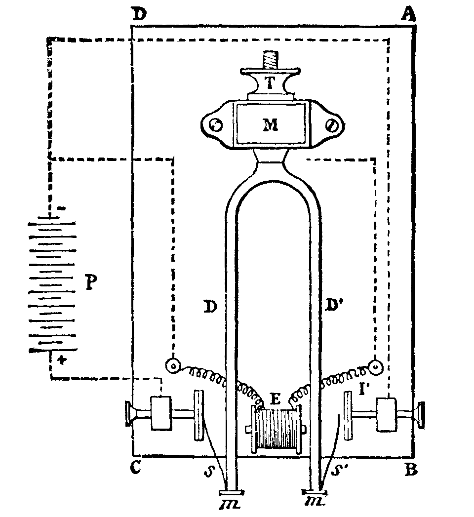 The Generator.—This consists of a cylindrical leaden receptacle, D, on the bottom of which rests a leaden bell containing apertures, c, at its base. A partition, c, into which is screwed a leaden tube, C, containing apertures divides the interior of the bell into two compartments. The upper of these latter is surmounted by a mouth, B, closed by a clamp, and through which the bicarbonate of soda is introduced. A definite quantity of water and sulphuric acid having been poured into the receptacle, D, a level tends to take place between the latter and the bell, C, the liquid passing through the apertures. But the acidulated water, coming in contact with the soda, sets free carbonic acid gas, which, having no exit, forces the water back and stops the production of gas until the apparatus is set in motion. At this moment, the suction of the pump causes a new inflow of acidulated water upon the soda, from whence another disengagement of gas, and then a momentary forcing of the water, whose level thus alternately rises and falls and causes a continuous production of gas proportionate with the suction of the pump.