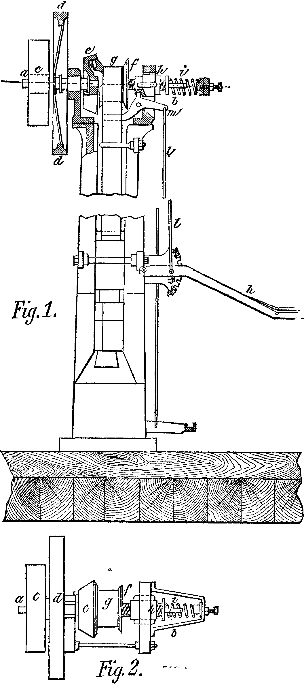 ab is the shaft having a continuous rotary motion, and upon which are fixed the pulley, c, the fly-wheel, d, and the friction-disk, e. Upon one of the extremities of the driving shaft is fixed an elongated sleeve, formed of the drum, g, and of the screw, f, carried by the nut, h. This latter is supported in the frame in such a way that it cannot turn, but can move easily in the direction of the axis. Such motion may be produced by the spring, i, and its extent is such that the drum, g, is brought in contact with the friction-disk, e.