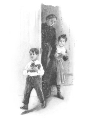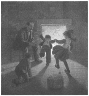 'Cause I hear Santy's voice outside!" An' Bang! bang! bang! we heerd the door— Nen it flewed open, an' the floor Blowed full o' snow—that's first we saw, |