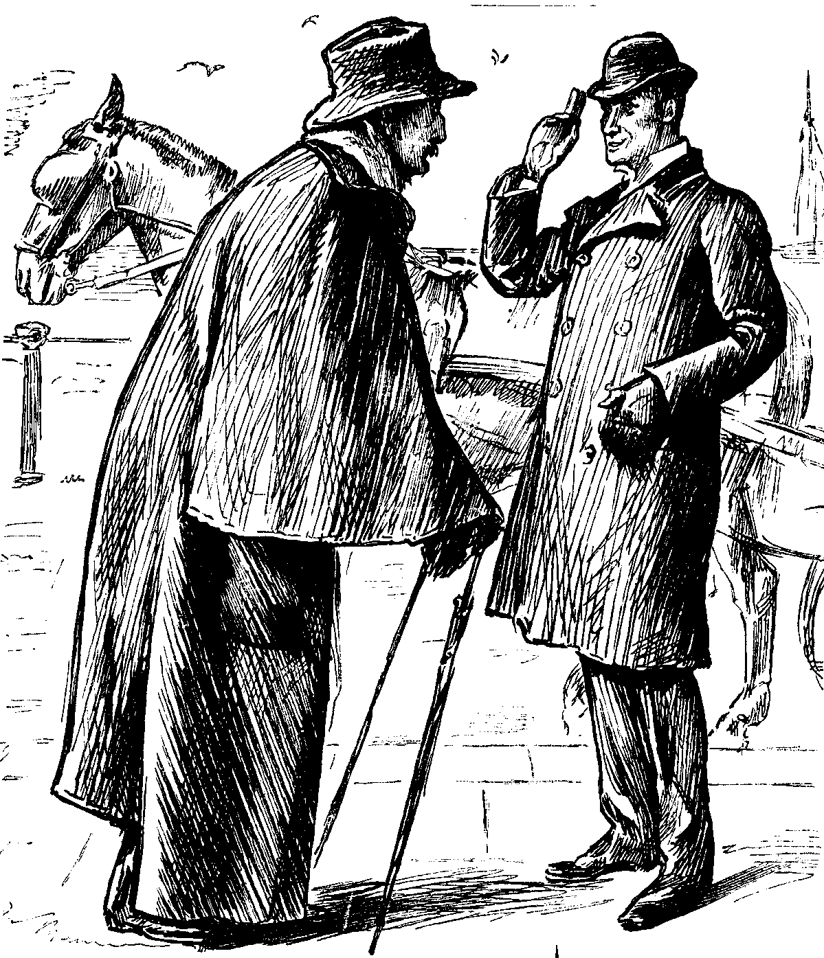 Local Flyman (who also officiates at Funerals). "Mornin', Sir. Glad to see you out again! Really thought I should 'a' had the honor of Drivin' you to the Cemetery, Sir!"