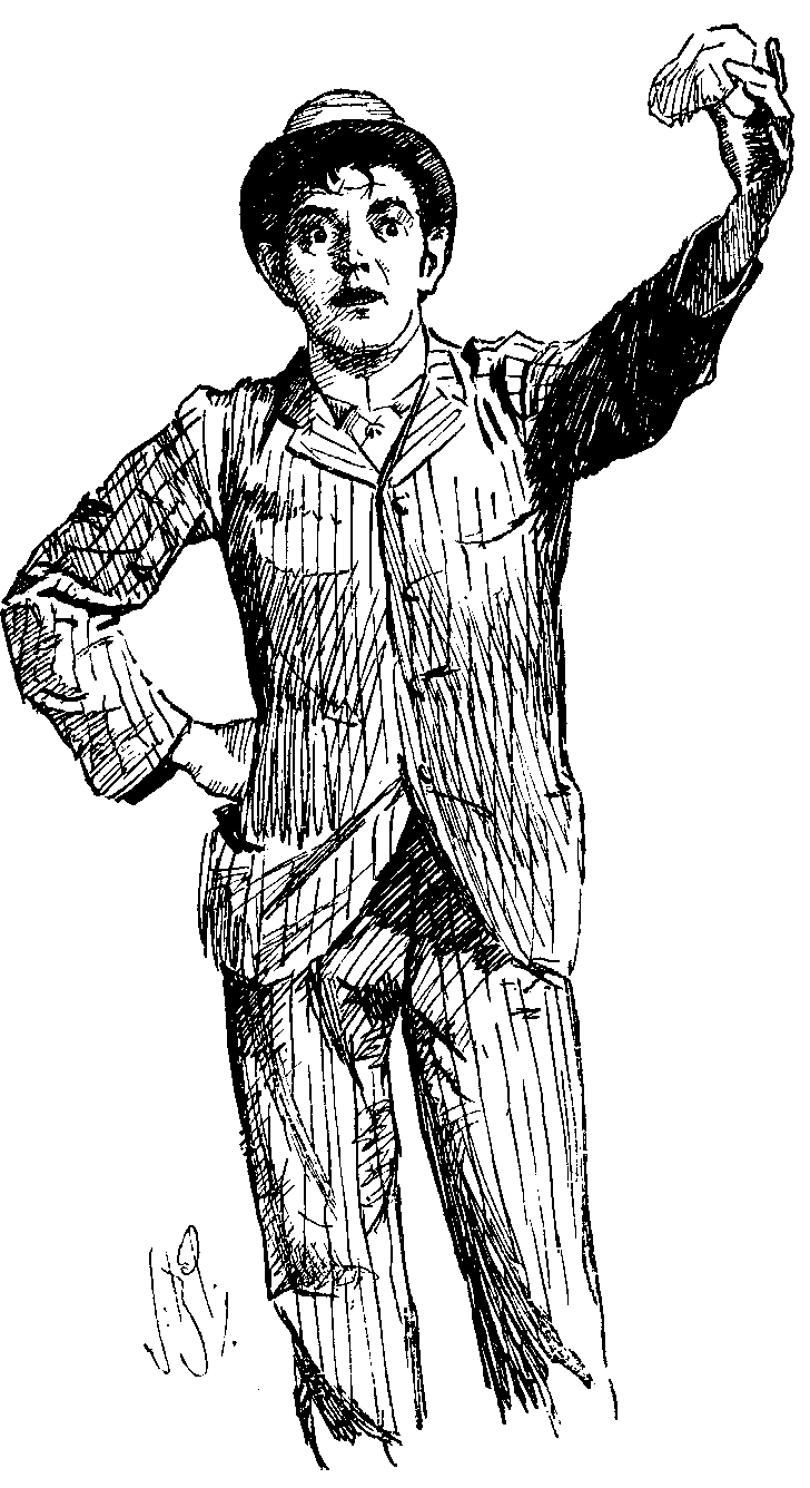 The Young Man (as a group collects around him). Now, I'm 'ere to orfer those among yer who 'ave the courage to embark in speckilation an unrivalled opportunity of enriching themselves at next to no expense. Concealed in each o' these small porcels is a prize o' more or less value, amongst them bein', I may tell yer, two 'undred threepenny pieces, not to mention 'igher coins up to 'arf a sov'rin. Mind, I promise nothing—I only say this: that those who show confidence in me I'll reward beyond their utmost expectations.( To an Agricultural Labourer in the circle.) 'Ere, you Sir, 'ave you ever seen me before in all your life?