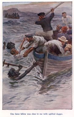 “He will bring the boy this time!” But no; he came up carrying a far heavier burden—a man wrapped in a cloak, and apparently unable to help himself. Dick shouted to one of the crew to go aboard and help him. Together they got the sick man into the boat. The little girl clasped her hands in her anxiety as she saw him lowered down. Sorrowfully she stooped over him, supporting his head in her arms; forgetting, apparently, where she was, and the fearful danger to which she was still exposed. The boy had followed the boatswain, apparently with the intention of leaping into the boat by himself. Dick was seen to hold him back: then he lifted him in his arms, and, waiting for the right moment, sprang into the boat.