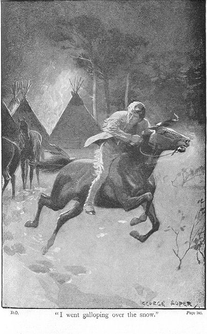 I went a mile before I stopped. Then, on reaching an elevation, whence I could have a clear view over the white glittering plain, I looked back at the spot where I had spent so many days and nights of pain and suffering, and where also I owned that I had been most mercifully preserved from so many dangers. The tent stood where it had been for many months, the smoke was curling out of the top into the calm sky, and all around looked so unchanged that I could scarcely persuade myself that in the interior was collected a band of malignant foes, who would rejoice in my destruction. I looked but a few seconds, and then away I went on my course. I walked on, sometimes breaking into a run where the snow was harder and would allow it, till sunset, and then the stars came out brightly in the firmament of heaven, and I was able to steer my course with greater certainty even than in the daytime. I could not think very much; but I did feel thankful that I had not yielded to the temptation of drinking the spirits myself, when I had felt low and almost hopeless. Had I done so, I should have destroyed the very means presented for my deliverance. I got over the plain with tolerable ease, for the sun had at times melted the snow, which when it froze again had become hard and rough. As I ran on, however, I was trying to devise some plan by which the Indians might be turned off my track. To obliterate it, however, was hopeless, unless a heavy fall of snow should come on, and even then the cunning rascals, by scraping away the snow at intervals, were very likely to find me out.