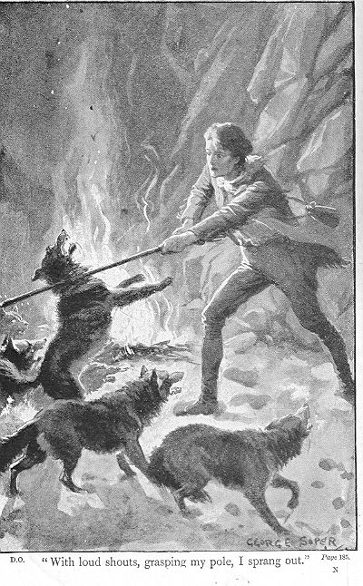 Nearer and nearer approached the cries and howls. They commenced as before, scampering round the tent, and every time it seemed narrowing the circle. I knew that they must be closer to me. I stirred up my fire with a long stick I kept by me for that purpose, and I felt sure I saw the impression of their noses as, having smelled me out, they pressed them against the sides of the tent in their endeavours to find an entrance. I looked for the biggest bump, and took aim with my revolver. There was a loud snarl and cry, and then a shrieking and howling as the horrid pack scampered off into the distance. I had to get up and patch the hole made by my bullet, but I did not look out to see what had become of the wolf I had hit. I heard the animals howling away the livelong night in the distance. They did not, however, venture back again that night.