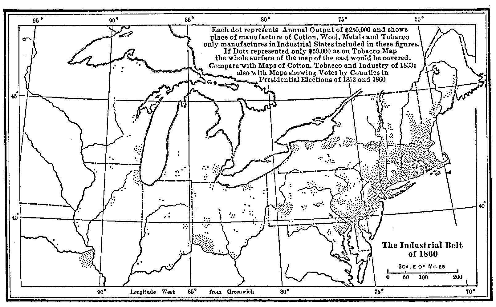To make this task easier some twenty-five maps have been prepared and inserted at the appropriate places in the text. These maps, perhaps one might say photographs of social or economic conditions, attempt to present the greater sectional and industrial groups of “interests” which entered into the common life of ante-bellum times. They treat party evolution, economic development, and social antagonisms in a way which, it seems to the author, should help the reader to a better understanding of things than would be possible by the simple narrative.