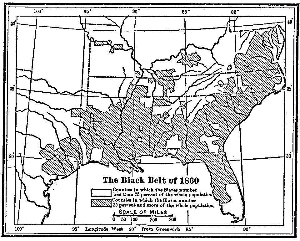 So that while the total annual crop value of Southern plantations amounted to $40,000,000, and the per capita wealth of the white people of the so-called black belt was very large, the returns from three industries located in a much narrower industrial belt of the East were more than a third greater. The taxable value of the slaves who produced most of the cotton and tobacco was not less than $1,000,000,000; the total investments of the East in manufactures of all kinds was certainly not more than a fourth as great as that in slaves. And what made this development the more significant was the fact that nearly all that the black belt produced was sold in Europe, while nearly all that the industrial belt produced was sold to the people of the United States, mostly to States which were not engaged in manufacturing at all.