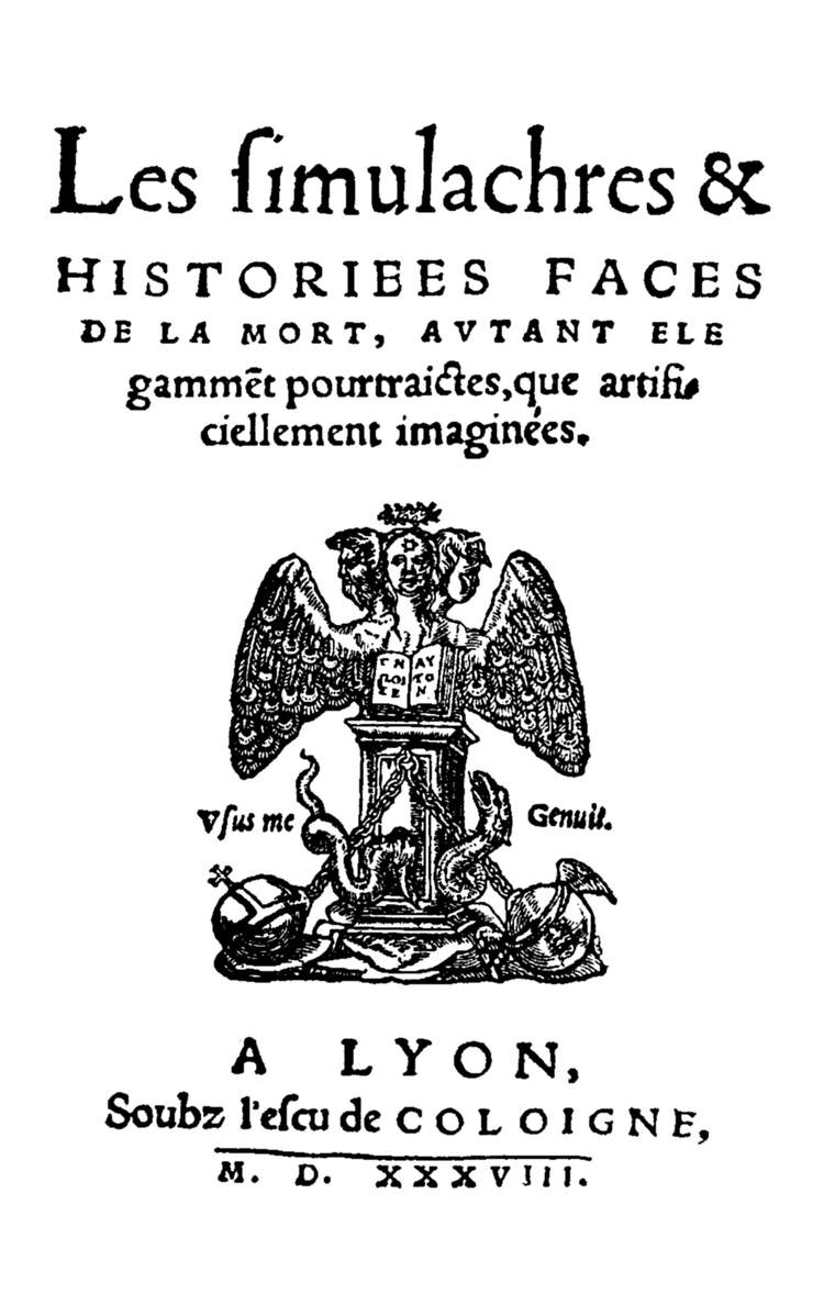 "Les Simulachres & Historiées Faces de la Mort avtant elegamtment pourtraictes, que artificiellement imaginées." This may be Englished as follows: The Images and Storied Aspects of Death, as elegantly delineated as [they are] ingeniously imagined. Such is the literal title of the earliest edition of the famous book now familiarly known as "Holbein's Dance of Death." It is a small quarto, bearing on its title-page, below the French words above [6] quoted, a nondescript emblem with the legend Vsus me Genuit, and on an open book, Gnothe seauton. Below this comes again, "A Lyon, Soubz l'escu de Coloigne: M. D. XXXVIII," while at the end of the volume is the imprint "Excvdebant Lvgdvni Melchoir et Gaspar Trechsel fratres: 1538,"—the Trechsels being printers of German origin, who had long been established at Lyons. There is a verbose "Epistre" or Preface in French to the "moult reuerende Abbesse du religieux conuent S. Pierre de Lyon, Madame Iehanne de Touszele," otherwise the Abbess of Saint Pierre les Nonnains, a religious house containing many noble and wealthy ladies, and the [7] words, "Salut d'un vray Zèle," which conclude the dedicatory heading, are supposed to reveal indirectly the author of the "Epistre" itself, namely, Jean de Vauzelles, Pastor of St. Romain and Prior of Monrottier, one of three famous literary brothers in the city on the Rhone, whose motto was "D'un vray Zelle." After the Preface comes "Diuerses Tables de Mort, non painctes, mais extraictes de l'escripture saincte, colorées par Docteurs Ecclesiastiques, & umbragées par Philosophes." Then follow the cuts, forty-one in number, each having its text from the Latin Bible above it, and below, its quatrain in French, this latter being [8] understood to be from the pen of one Gilles Corozet. To the cuts succeed various makeweight Appendices of a didactic and hortatory character, the whole being wound up by a profitable discourse, De la Necessite de la Mort qui ne laisse riens estre pardurable. Various editions ensued to this first one of 1538, the next or second of 1542 (in which Corozet's verses were translated into Latin by Luther's brother-in-law, George Oemmel or Aemilius), being put forth by Jean and François Frellon, into whose hands the establishment of the Trechsels had fallen. There were subsequent issues in 1545, 1547, 1549, 1554, and 1562. To the [9] issues of 1545 and 1562 a few supplementary designs were added, some of which have no special bearing upon the general theme, although attempts, more or less ingenious, have been made to connect them with the text. After 1562 no addition was made to the plates.