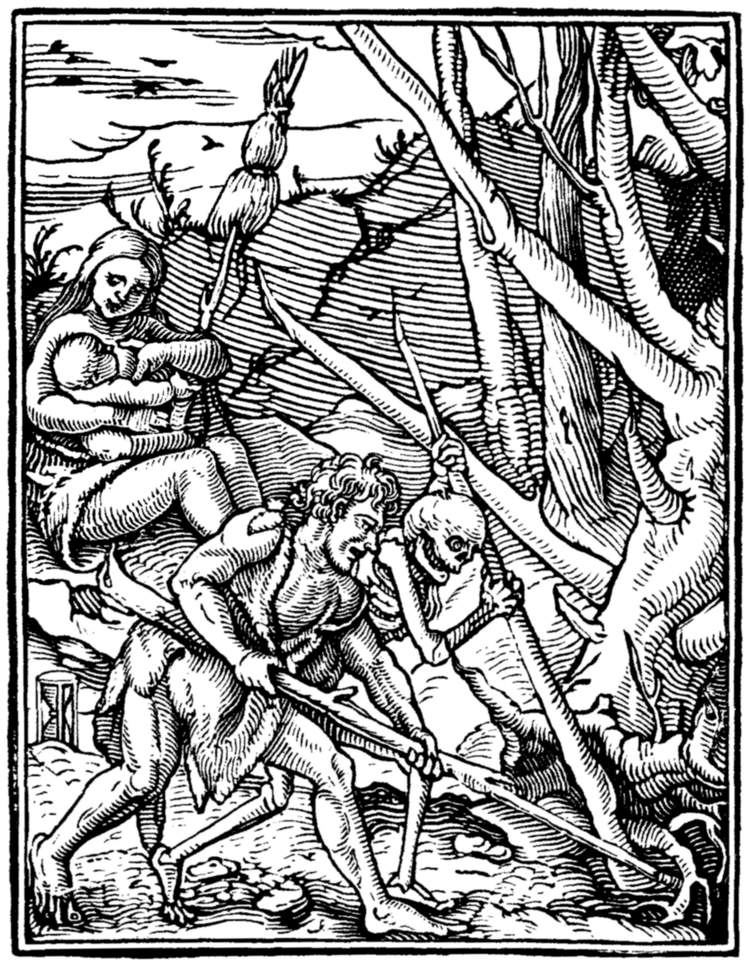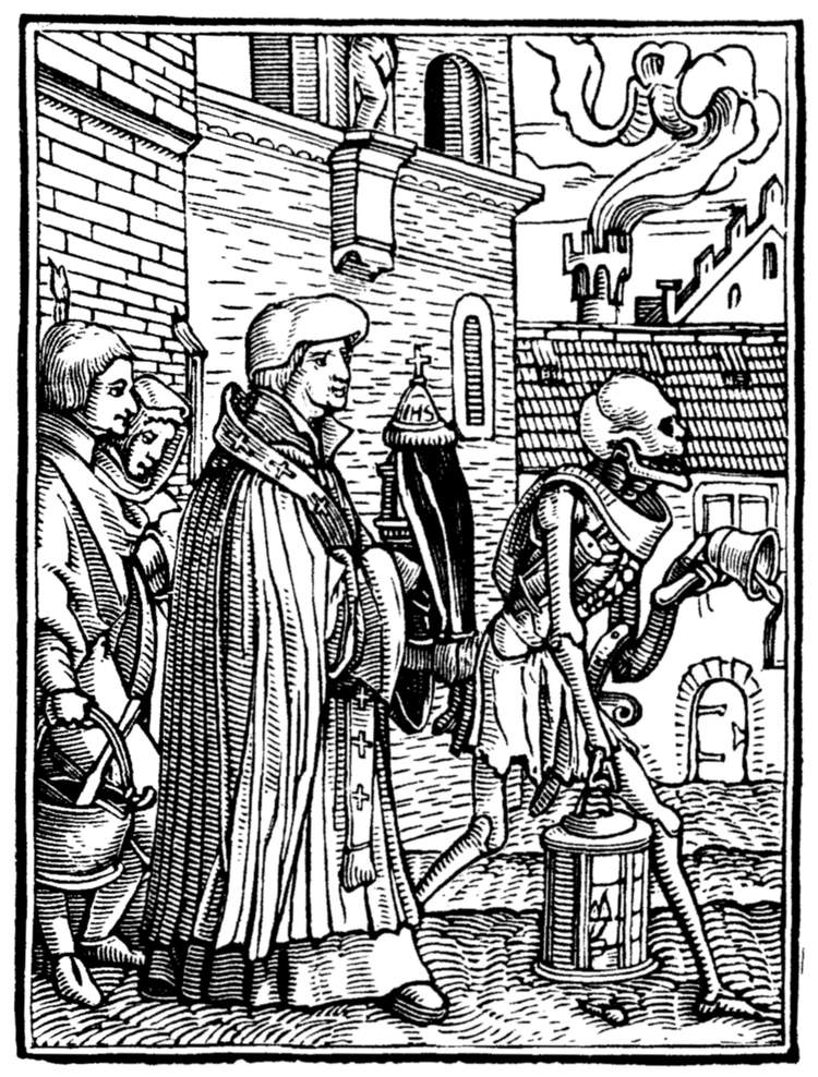 A crowd of skeletons, playing on horns, trumpets, and the like, summon mankind to the grave. | |