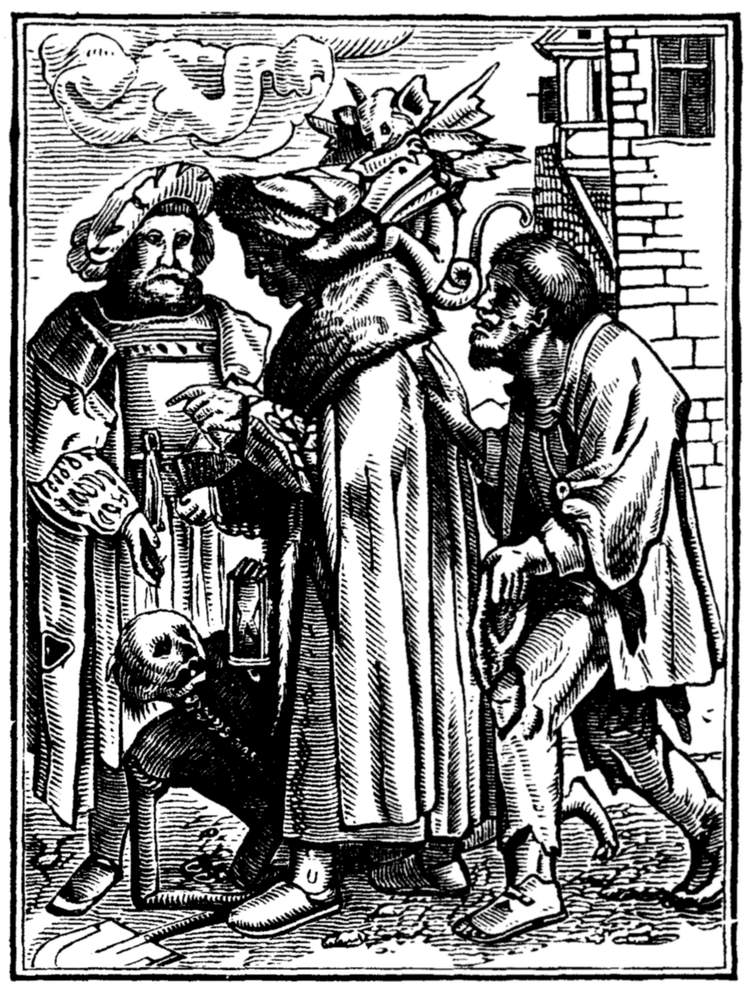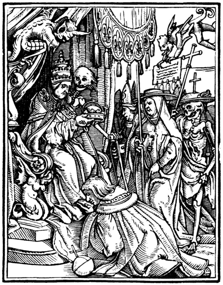 The Pope (Leo X.) with Death at his side, crowns an Emperor, who kisses his foot. Another Death, in a cardinal's hat, is among the assistants. | |