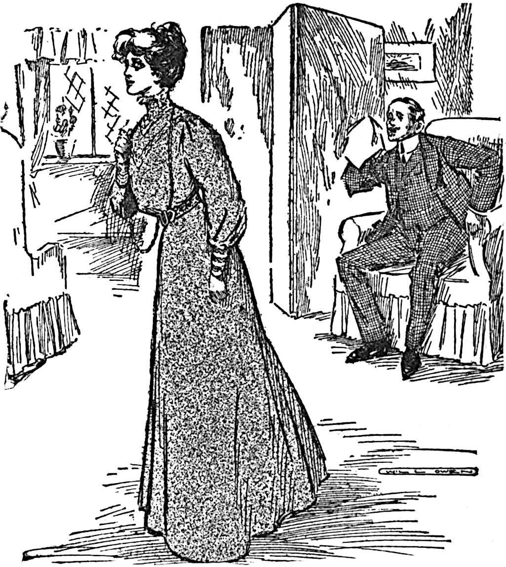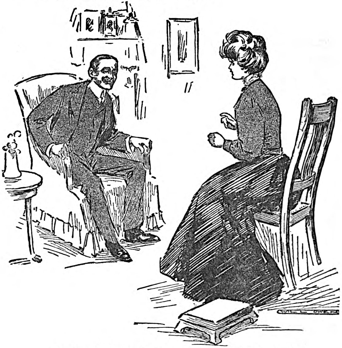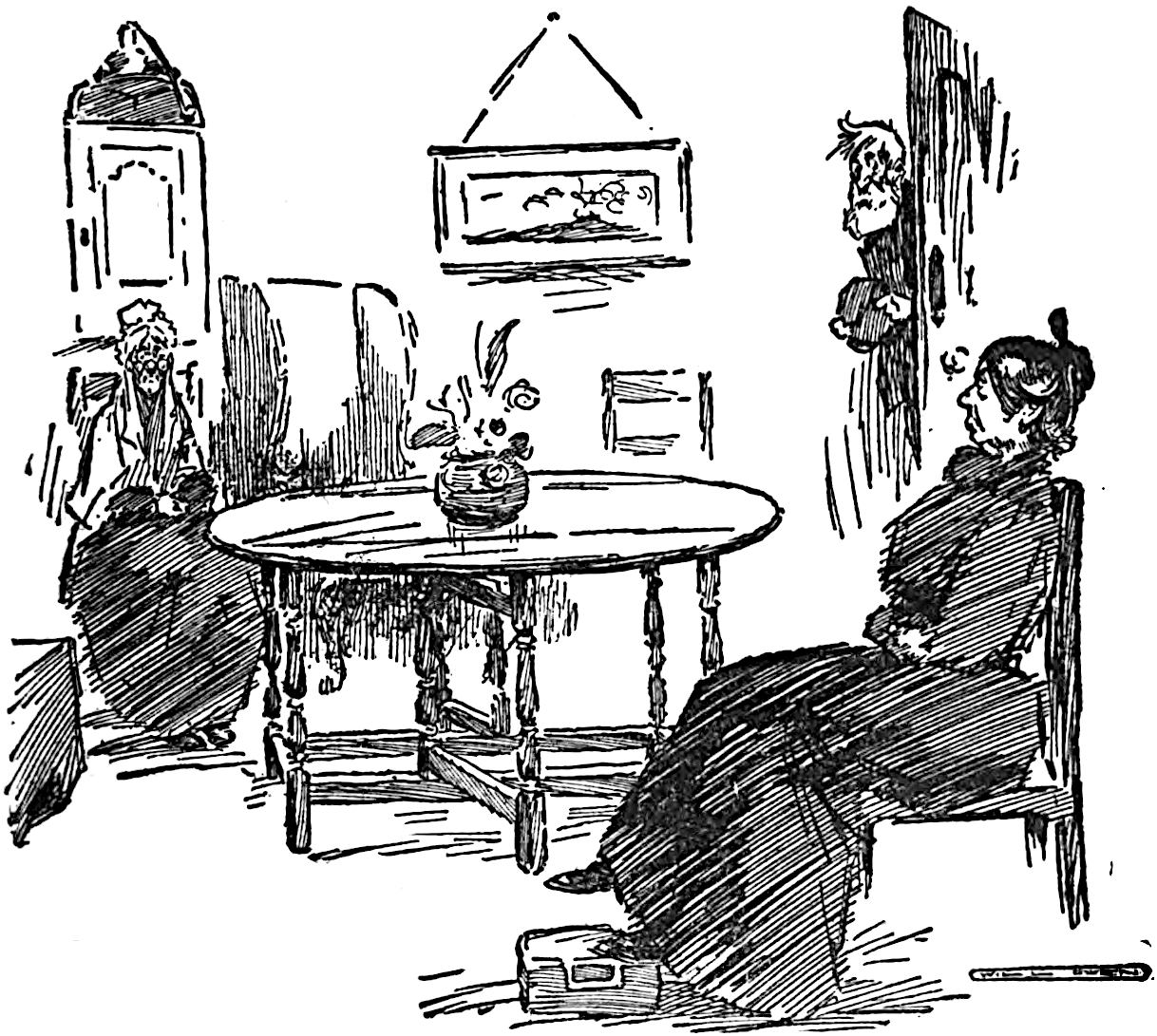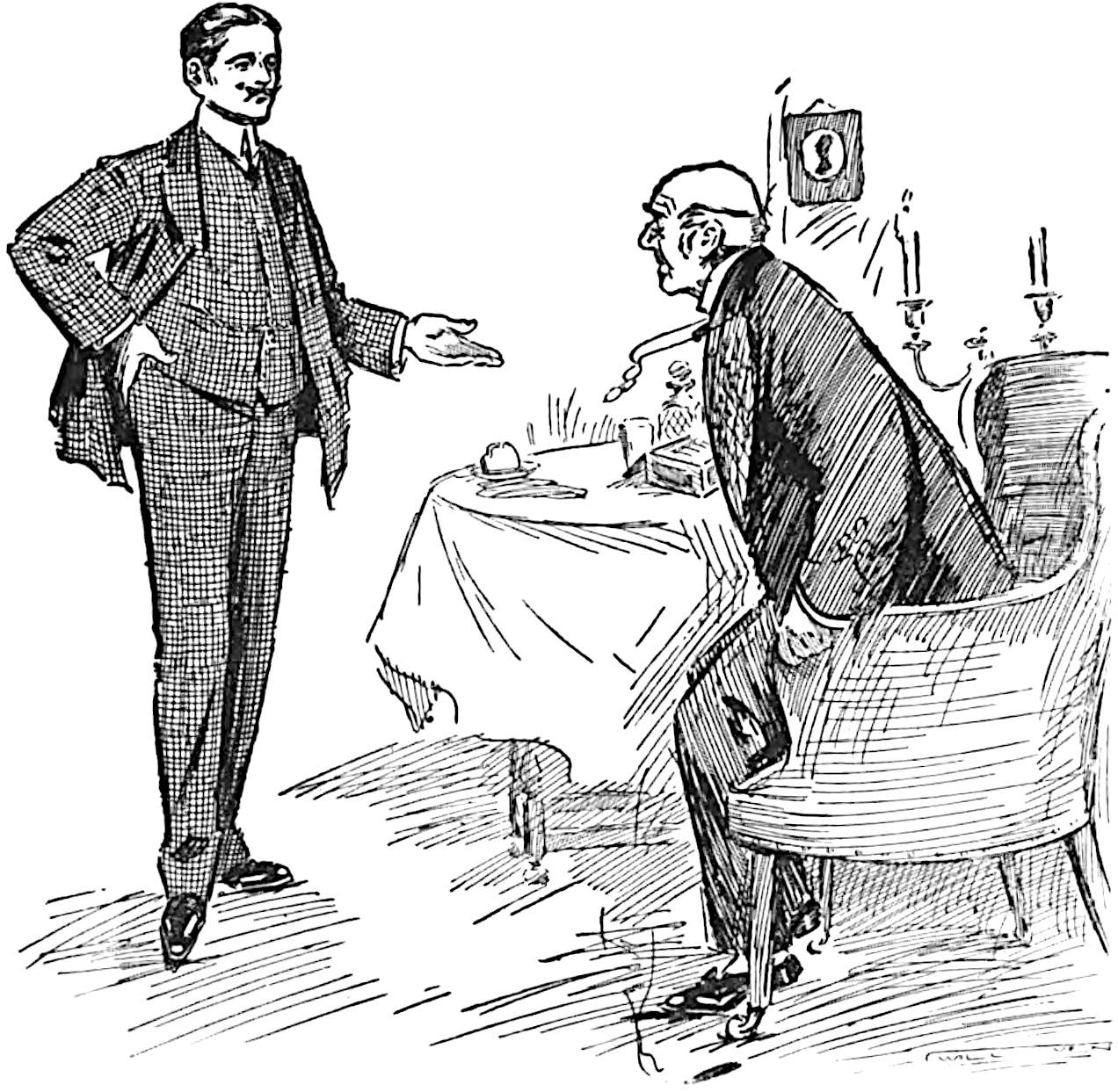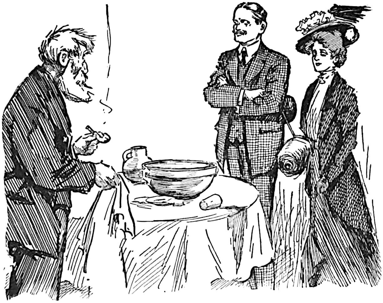 He closed the door behind them, and, while Mr. Vyner stood gazing moodily at the mound on the table which appeared to have been hastily covered up with a rather soiled towel, placed a couple of easy chairs by the fire. Mr. Vyner, with his eyes still on the table, took his seat slowly, and then transferring his regards to Captain Trimblett, asked him in a stern vein what he was smiling at Joan for.