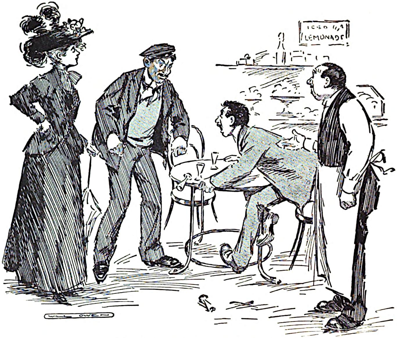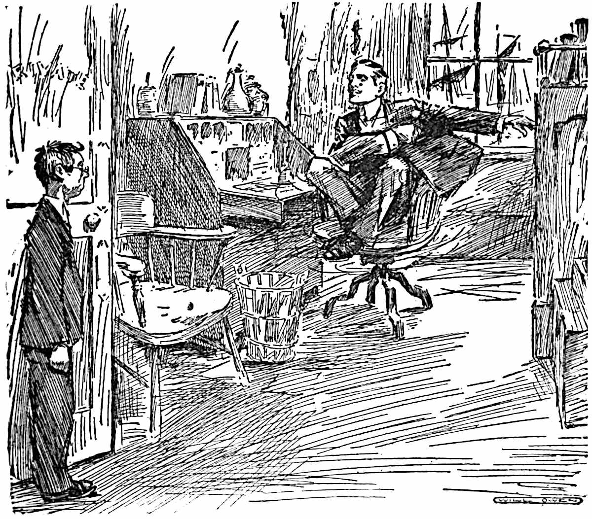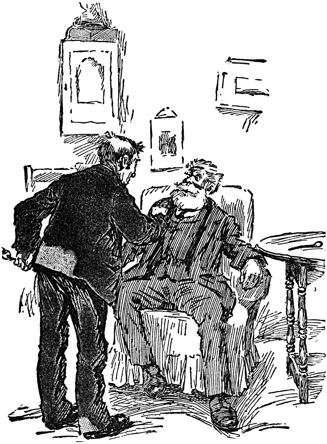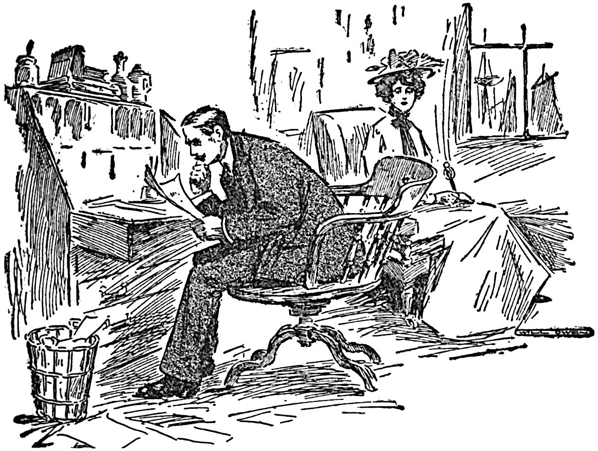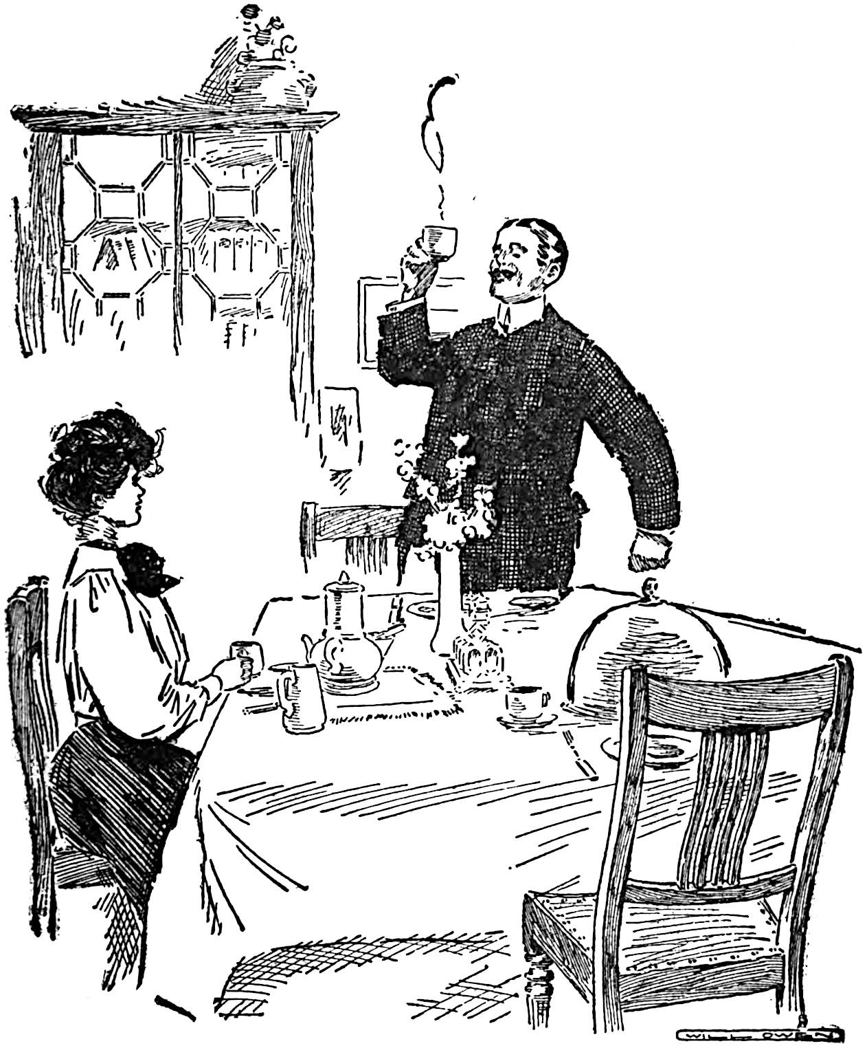 He closed the door behind them, and, while Mr. Vyner stood gazing moodily at the mound on the table which appeared to have been hastily covered up with a rather soiled towel, placed a couple of easy chairs by the fire. Mr. Vyner, with his eyes still on the table, took his seat slowly, and then transferring his regards to Captain Trimblett, asked him in a stern vein what he was smiling at Joan for.