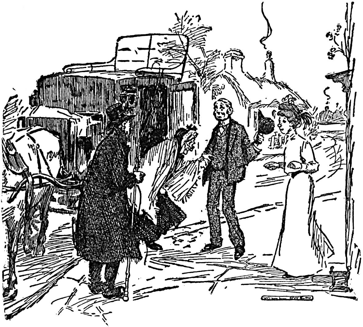 Mr. Saunders thanked him, and reaching down his coat put it on and followed Mr. Hartley to the house. The latter, steering him round by the side-entrance, accompanied him to the front gate.