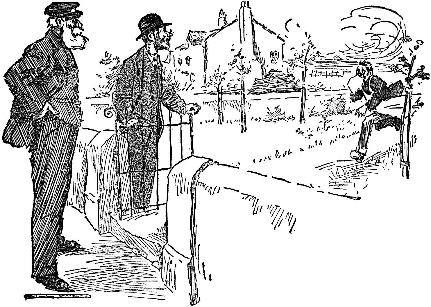 Mr. Hartley said she was, and, in an abstracted fashion, led the way down the garden to where an enormous patch of land—or so it seemed to Mr. Saunders—awaited digging. The latter removed his coat and, hanging it with great care on an apple tree, turned back his cuffs and seized the fork.