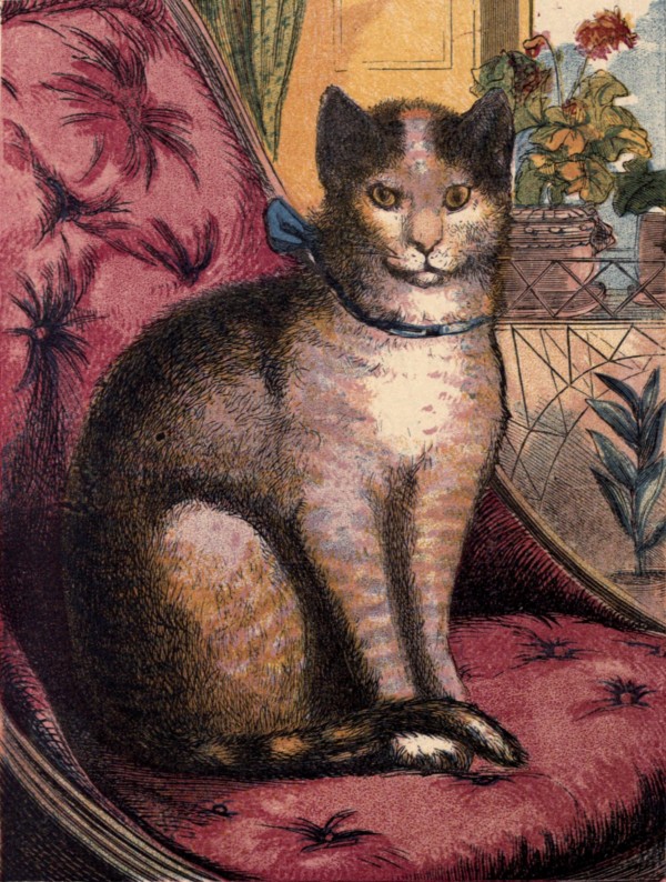 This is Pol-ly's own cat, Top-sy. She looks ve-ry prim and quiet; but if you play with her, you will find she is a ve-ry mer-ry lit-tle cat. She will jump up-on the ta-ble at break-fast, and run off with Pol-ly's toast; and if mam-ma be wri-ting a let-ter, Top-sy will steal soft-ly a-long the arm of the so-fa, and rub her paw o-ver the last word mam-ma has writ-ten, and make a great blot in the let-ter. Some-times she will sit as still as a mouse on Un-cle Tom's shoul-der while he is read-ing, and look so grave-ly on the book that you might think she was read-ing too: but she is not quite wise e-nough for that.