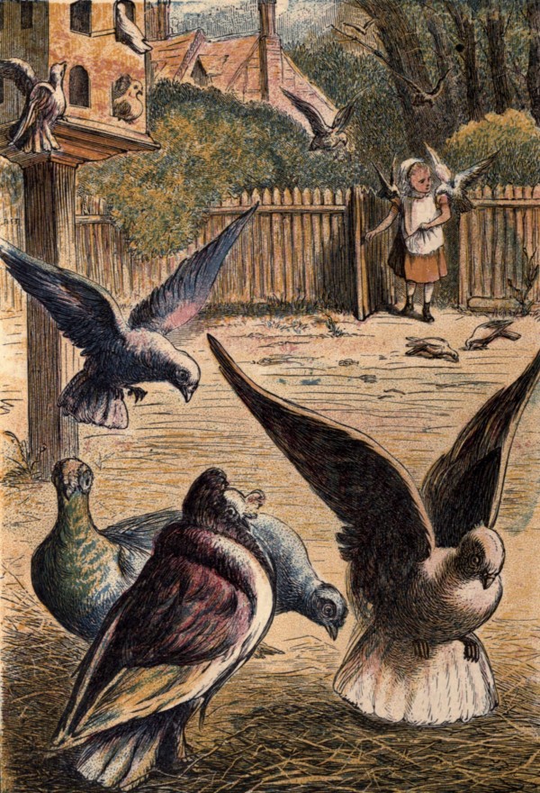 These pi-geons be-long to lit-tle Pol-ly. They have a ve-ry pret-ty house to live in, and Pol-ly feeds them e-ve-ry morn-ing with bar-ley or peas. When they see her come with her lit-tle bas-ket, they all fly down from the roof of the dove-cot, and will hop round her, perch on her should-er, and eat from her hand. But if they see Top-sy steal-ing un-der the Trees, or Car-lo run-ning o-ver the grass-plot, a-way they all fly. The Pi-geons trust Pol-ly, but they will not trust sly puss, nor rough Car-lo. [6]Pret-ty, shy pets, are Pol-ly's pi-geons.