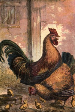 Lit-tle Pol-ly went e-ve-ry morn-ing to the Poul-try yard to see the Poul-try wo-man feed the fowls. Her mam-ma had gi-ven her a Cock and a Hen, and a fine brood of chickens, to be her own. She fed them her-self, and they were al-ways rea-dy to come round her when they heard her say, Chuck! chuck! Pol-ly was nev-er a-fraid of the fine, bold Cock, even when he crow-ed so loud-ly that you might have heard him a mile off. He was ve-ry fierce if a-ny o-ther cock came near his fa-mi-ly, but he was quite tame with Pol-ly, and bow-ed like a gen-tle-man when she gave him his bar-ley.[11]