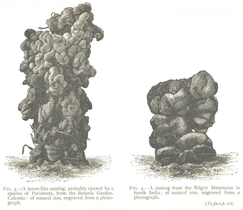 [101] Dr. King gave me some worms collected near Nice, which, as he believes, had constructed these castings. They were sent to M. Perrier, who with great kindness examined and named them for me: they consisted of Perichæta affinis, a native of Cochin China and of the Philippines; P. Luzonica, a native of Luzon in the Philippines; and P. Houlleti, which lives near Calcutta. M. Perrier informs me that species of Perichæta have been naturalized in the gardens near Montpellier and in Algiers. Before I had any reason to suspect that the tower-like castings from Nice had been formed by worms not endemic in the country, I was greatly surprised to see how closely they resembled castings sent to me from near Calcutta, where it is known that species of Perichæta abound.