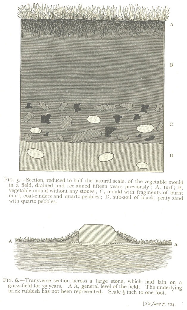In the year 1837, a short paper was read by me before the Geological Society of London, [3] “On the Formation of Mould,” in which it was shown that small fragments of burnt marl, cinders, &c., which had been thickly strewed over the surface of several meadows, were found after a few years lying at the depth of some inches beneath the turf, but still forming a layer. This apparent sinking of superficial bodies is due, as was first suggested to me by Mr. Wedgwood of Maer Hall in Staffordshire, to the large quantity of fine earth continually brought up to the surface by worms in the form of castings. These castings are sooner or later spread out and cover up any object left on the surface. I was thus led to conclude that all the vegetable mould over the whole country has passed many times through, and will again pass many times through, the intestinal canals of worms. Hence the term “animal mould” would be in some respects more appropriate than that commonly used of “vegetable mould.”
