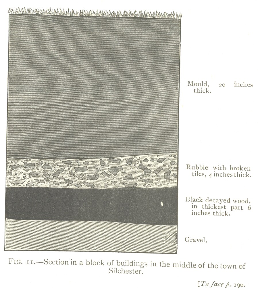 The accumulation of rubbish on the sites of great cities independent of the action of worms—The burial of a Roman villa at Abinger—The floors and walls penetrated by worms—Subsidence of a modern pavement—The buried pavement at Beaulieu Abbey—Roman villas at Chedworth and Brading—The remains of the Roman town at Silchester—The nature of the débris by which the remains are covered—The penetration of the tesselated floors and walls by worms—Subsidence of the floors—Thickness of the mould—The old Roman city of Wroxeter—Thickness of the mould—Depth of the foundations of some of the Buildings—Conclusion. |