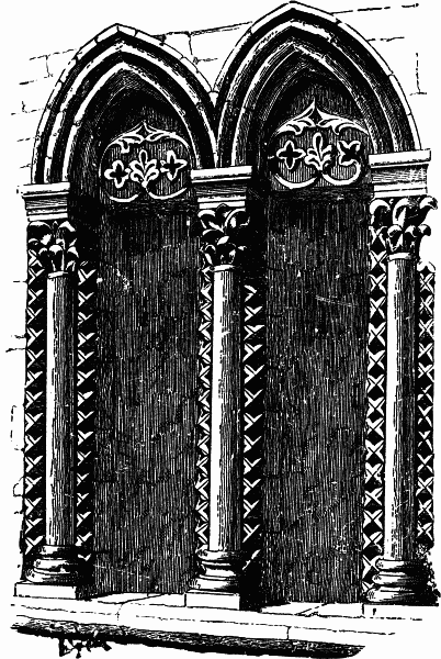 For this simple reason, that, while in architecture you are continually called upon to do what may be unnecessary for the sake of beauty, you are never called upon to do what is inconvenient for the sake of beauty. You want the level window sill to lean upon, or to allow the window to open on a balcony: the eye and the common sense of the beholder require this necessity to be met before any laws of beauty are thought of. And besides this, there is in the sill no necessity for the pointed arch as a bearing form; on the contrary, it would give an idea of weak support for the sides of the window, and therefore is at once rejected. Only I beg of you particularly to observe that the level sill, although useful, and therefore admitted, does not therefore become beautiful; the eye does not like it so well as the top of the window, nor does the sculptor like to attract the eye to it; his richest moldings, traceries, and sculptures are all reserved for the top of the window; they are sparingly granted to its horizontal base. And farther, observe, that when neither the convenience of the sill, nor the support of the structure, are any more of moment, as in small windows and traceries, you instantly have the point given to the bottom of the window. Do you recollect the west window of your own Dunblane Abbey? If you look in any common guide-book, you will find it pointed out as peculiarly beautiful,—it is acknowledged to be beautiful by the most careless observer. And why beautiful? Look at it (fig. 7). Simply because in its great contours it has the form of a forest leaf, and because in its decoration it has used nothing but forest leaves. The sharp and expressive molding which surrounds it is a very interesting example [16] of one used to an enormous extent by the builders of the early English Gothic, usually in the form seen in fig. 2, Plate II., composed of clusters of four sharp leaves each, originally produced by sculpturing the sides of a four-sided pyramid, and afterwards brought more or less into a true image of leaves, but deriving all its beauty from the botanical form. In the present instance only two leaves are set in each cluster; and the architect has been determined that the naturalism should be perfect. For he was no common man who designed that cathedral of Dunblane. I know not anything so perfect in its simplicity, and so beautiful, as far as it reaches, in all the Gothic with which I am acquainted. And just in proportion to his power of mind, that man was content to work under Nature's teaching; and instead of putting a merely formal dogtooth, as everybody else did at the time, he went down to the woody bank of the sweet river beneath the rocks on which he was building, and he took up a few of the fallen leaves that lay by it, and he set them in his arch, side by side, forever. And, look—that he might show you he had done this,—he has made them all of different sizes, just as they lay; and that you might not by any chance miss noticing the variety, he has put a great broad one at the top, and then a little one turned the wrong way, next to it, so that you must be blind indeed if you do not understand his meaning. And the healthy change and playfulness of this just does in the stone-work what it does on the tree boughs, and is a perpetual refreshment and invigoration; so that, however long you gaze at this simple ornament—and none can be simpler, a village mason could carve it all round the window in a few hours—you are never weary of it, it seems always new.