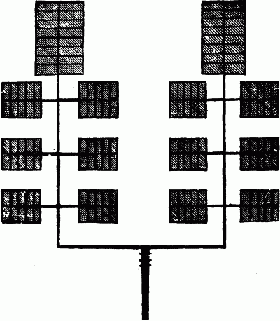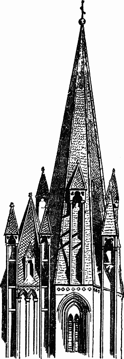 21. From this form to the true spire the change is slight, and consists in little more than various decoration; generally in putting small pinnacles at the angles, and piercing the central pyramid with traceried windows; sometimes, as at Fribourg and Burgos, throwing it into tracery altogether: but to do this is invariably the sign of a vicious style, as it takes away from the spire its character of a true roof, and turns it nearly into an ornamental excrescence. At Antwerp and Brussels, the celebrated towers (one, observe, ecclesiastical, [24] being the tower of the cathedral, and the other secular), are formed by successions of diminishing towers, set one above the other, and each supported by buttresses thrown to the angles of the one beneath. At the English cathedrals of Lichfield and Salisbury, the spire is seen in great purity, only decorated by sculpture; but I am aware of no example so striking in its entire simplicity as that of the towers of the cathedral of Coutances in Normandy. There is a dispute between French and English antiquaries as to the date of the building, the English being unwilling to admit its complete priority to all their own Gothic. I have no doubt of this priority myself; and I hope that the time will soon come when men will cease to confound vanity with patriotism, and will think the honor of their nation more advanced by their own sincerity and courtesy, than by claims, however learnedly contested, to the invention of pinnacles and arches. I believe the French nation was, in the twelfth and thirteenth centuries, the greatest in the world; and that the French not only invented Gothic architecture, but carried it to a perfection which no other nation has approached, then or since: but, however this may be, there can be no doubt that the towers of Coutances, if not the earliest, are among the very earliest, examples of the fully developed spire. I have drawn one of them carefully for you (fig. 11), and you will see immediately that they are literally domestic roofs, with garret windows, executed on a large scale, and in stone. Their only ornament is a kind of scaly mail, which is nothing more than the copying in stone of the common wooden shingles of the house-roof; and their security is provided for by strong gabled dormer windows, of massy masonry, which, though supported on detached shafts, have weight enough completely to balance the lateral thrusts of the spires. Nothing can surpass the boldness or the simplicity of the plan; and yet, in spite of this simplicity, the clear detaching of the shafts from the slope of the spire, and their great height, strengthened by rude cross-bars of stone, carried back to the wall behind, occasion so great a complexity and play of cast [25] shadows, that I remember no architectural composition of which the aspect is so completely varied at different hours of the day.[10] But the main thing I wish you to observe is, the complete domesticity of the work; the evident treatment of the church spire merely as a magnified house-roof; and the proof herein of the great truth of which I have been endeavoring to persuade you, that all good architecture rises out of good and simple domestic work; and that, therefore, before you attempt to build great churches and palaces, you must build good house doors and garret windows.