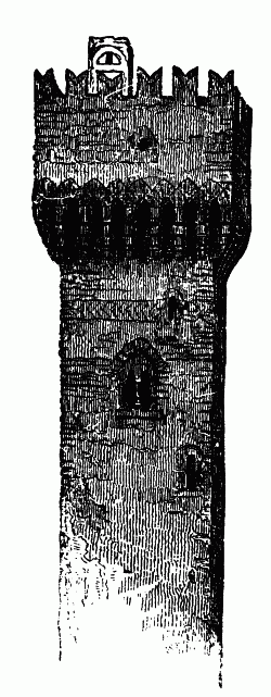 Many of us are familiar with the ordinary form of the Italian bell-tower or campanile. From the eighth century to the thirteenth there was little change in that form:[8] four-square, rising high and without tapering into the air, story above story, they stood like giants in the quiet fields beside the piles of the basilica or the Lombardic church, in this form (fig. 9), tiled at the top in a flat gable, with open arches below, and fewer and fewer arches on each inferior story, [23] down to the bottom. It is worth while noting the difference in form between these and the towers built for military service. The latter were built as in fig. 10, projecting vigorously at the top over a series of brackets or machicolations, with very small windows, and no decoration below. Such towers as these were attached to every important palace in the cities of Italy, and stood in great circles—troops of towers—around their external walls: their ruins still frown along the crests of every promontory of the Apennines, and are seen from far away in the great Lombardic plain, from distances of half-a-day's journey, dark against the amber sky of the horizon. These are of course now built no more, the changed methods of modern warfare having cast them into entire disuse; but the belfry or campanile has had a very different influence on European architecture. Its form in the plains of Italy and South France being that just shown you, the moment we enter the valleys of the Alps, where there is snow to be sustained, we find its form of roof altered by the substitution of a steep gable for a flat one.[9] There are probably few in the room who have not been in some parts of South Switzerland, and who do not remember the beautiful effect of the gray mountain churches, many of them hardly changed since the tenth and eleventh centuries, whose pointed towers stand up through the green level of the vines, or crown the jutting rocks that border the valley.