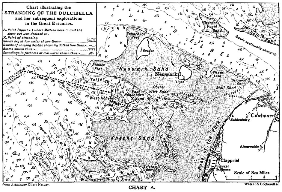 The fact was that, at breakfast on the morning after the arrival of the letter, I had still found that inexplicable lightening which I mentioned before, and strong enough to warrant a revival of the pros and cons. An important pro which I had not thought of before was that after all it was a good-natured piece of unselfishness to join Davies; for he had spoken of the want of a pal, and seemed honestly to be in need of me. I almost clutched at this consideration. It was an admirable excuse, when I reached my office that day, for a resigned study of the Continental Bradshaw, and an order to Carter to unroll a great creaking wall-map of Germany and find me Flensburg. The latter labour I might have saved him, but it was good for Carter to have something to do; and his patient ignorance was amusing. With most of the map and what it suggested I was tolerably familiar, for I had not wasted my year in Germany, whatever I had done or not done since. Its people, history, progress, and future had interested me intensely, and I had still friends in Dresden and Berlin. Flensburg recalled the Danish war of ’64, and by the time Carter’s researches had ended in success I had forgotten the task set him, and was wondering whether the prospect of seeing something of that lovely region of Schleswig-Holstein, [See Map A] as I knew from hearsay that it was, was at all to be set against such an uncomfortable way of seeing it, with the season so late, the company so unattractive, and all the other drawbacks which I counted and treasured as proofs of my desperate condition, if I were to go. It needed little to decide me, and I think K——’s arrival from Switzerland, offensively sunburnt, was the finishing touch. His greeting was “Hullo, Carruthers, you here? Thought you had got away long ago. Lucky devil, though, to be going now, just in time for the best driving and the early pheasants. The heat’s been shocking out there. Carter, bring me a Bradshaw”—(an extraordinary book, Bradshaw, turned to from habit, even when least wanted, as men fondle guns and rods in the close season).