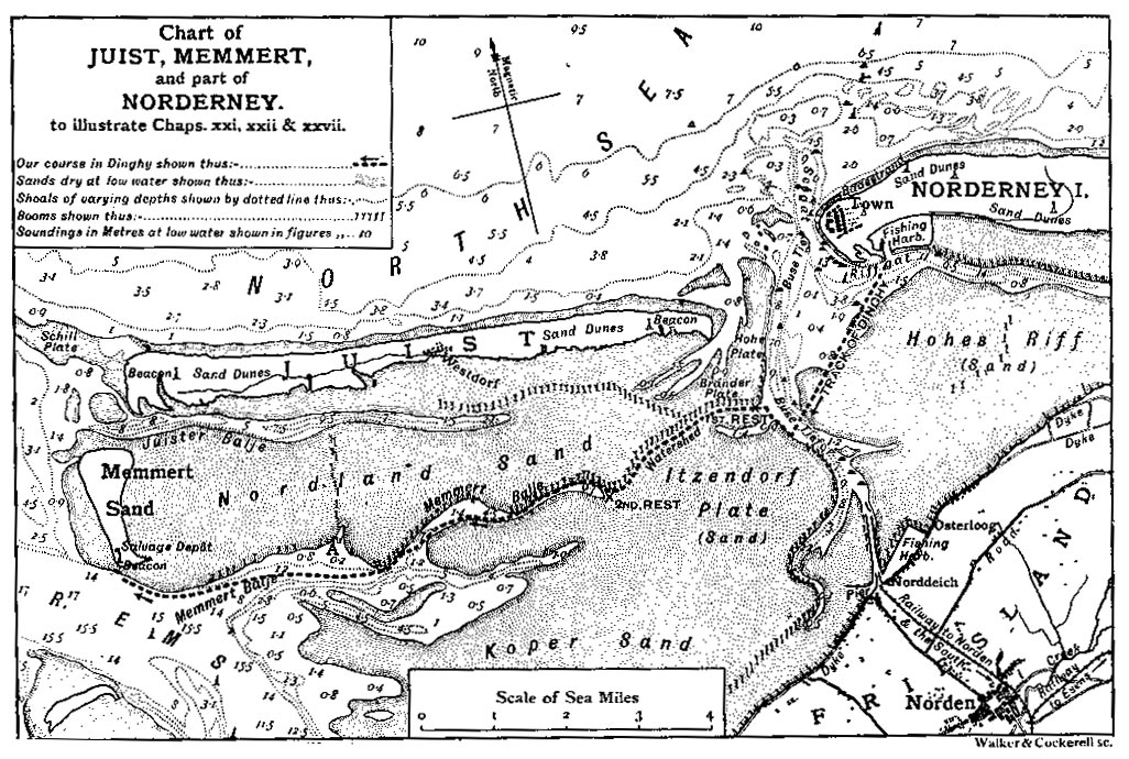 In October last (1902), my friend “Carruthers” visited me in my chambers, and, under a provisional pledge of secrecy, told me frankly the whole of the adventure described in these pages. Till then I had only known as much as the rest of his friends, namely, that he had recently undergone experiences during a yachting cruise with a certain Mr “Davies” which had left a deep mark on his character and habits.