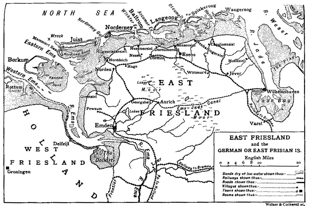 Such an expedition could be prepared in absolute secrecy, by turning to account the natural features of the German coast. No great port was to be concerned in any way. All that was required was sufficient depth of water to float the lighters and tugs; and this is supplied by seven insignificant streams, issuing from the Frisian littoral, and already furnished with small harbours and sluice-gates, with one exception, namely, the tidal creek at Norden; for this, it appeared, was one of the chosen seven, and not, as “Carruthers” supposed, Hilgenriedersiel, which, if you remember, he had no time to visit, and which has, in fact, no stream of any value at all, and no harbour. All of these streams would have to be improved, deepened, and generally canalised; ostensibly with a commercial end, for purposes of traffic with the islands, which are growing health resorts during a limited summer season.