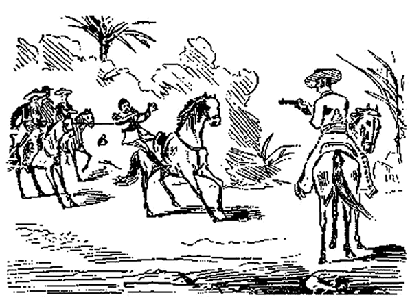 Je galopais donc content de moi-même et ne pensant nullement au danger, quant j'arrivai au gué d'une petite rivière qu'il me fallait traverser pour continuer ma route. Je lâchai la bride à mon cheval pour lui permettre de s''abreuver à l'eau claire qui roulait sur un lit de cailloux. Je me préparais à fumer une cigarette, quand le bruit des pas de plusieurs chevaux me fit tourner la tête. Je vis cinq ou six cavaliers qui se dirigeaient vers moi, mais qui, évidemment, jusque là, ne m'avaient pas encore aperçu.