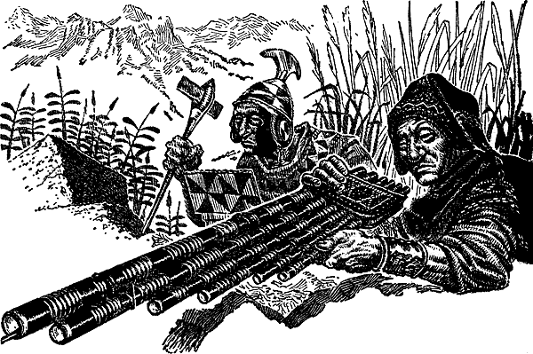 They found, as they penetrated deeper into the savage-infested hinterlands of the Empire of the Great Nobles, that the armor fended off more than just snakes. Hardly a day passed but one or more of the men would hear the sharp spang! of a blowgun-driven dart as it slammed ineffectually against his armored back or chest. At first, some of the men wanted to charge into the surrounding forest, whence the darts came, and punish the sniping aliens, but the commander would have none of it.