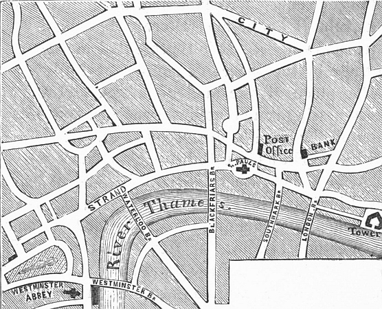 The city was the original London. The West End was at first called Westminster. The relative position of these two centres may be seen by the following map:—