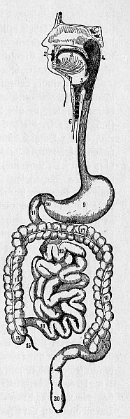 Abb. 1. Schema des Verdauungsrohres. 1 Gaumen, 2 Mundspalte, 3 Zunge, 4 Schlund, 5 Kehldeckel, 6 Luftröhre, 7 Speiseröhre, 8 Mageneingang, 9 Magen, 10 Magenausgang, 11 Zwölffingerdarm, mit dem der Dünndarm beginnt, 12 Dünndarmschlingen, 13 Übergang des Dünndarms in den Blinddarm, 14 Blinddarm, mit dem der Dickdarm beginnt, 15 Wurmfortsatz, 16, 17, 18 Dickdarm, 19, 20 Enddarm. Nach Rauber.
