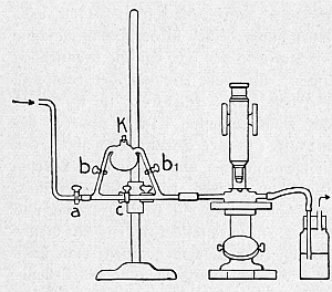Abb. 3. Versuchsanordnung zum Studium der Einzelligen. Unter dem Mikroskop die Glaskammer, die oben durch ein dünnes Deckglas abgeschlossen ist. Am Deckglas ein hängender Tropfen, in welchem sich die zu untersuchenden Zellen befinden. Nach links ist die Glaskammer mit einer Einrichtung verbunden, die es gestattet, verschiedene Gase durch die Glaskammer zu pressen: das gewünschte Gas, z. B. Luft, Sauerstoff oder Stickstoff, tritt aus einem Glasbehälter in der Richtung des links angebrachten Pfeiles in die Glaskammer ein und tritt in der Richtung des auf der rechten Seite der Abbildung angebrachten Pfeiles durch eine Wasserflasche wieder aus. Zwischen dem Gasbehälter und der Glaskammer mit den zu untersuchenden Tieren ist eine Vorrichtung aus Glas eingeschaltet, die es ermöglicht, nach Belieben Alkoholdämpfe dem Gas beizumischen. Öffnet man den Hahn a, so kann das Gas aus dem Gasbehälter in die Glaskammer unter dem Mikroskop strömen: und zwar durch c oder durch b, K und b1. Schließen wir die Hähne b und b1 ab, so gelangt das Gas (z. B. Luft oder Sauerstoff) durch c in die Glaskammer unter dem Mikroskop. Schließen wir aber c, so muß das Gas durch b, K und b1 strömen. In K, das ein kleines Glaskölbchen ist, können wir nach Öffnung des oben im Kölbchen steckenden Gummistopfens, einen kleinen Wattebausch hineinbringen, den wir vorher mit Alkohol getränkt haben: es werden sich also jetzt dem durch die Glaskammer unter dem Mikroskop strömenden Gase Alkoholdämpfe beimischen. Wollen wir nach einiger Zeit unseren Versuchstieren wieder frisches Gas zuführen, so brauchen wir nur b und b1 zu schließen und c zu öffnen. Nach Ishikawa und Verworn. Schematisiert.