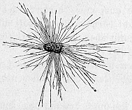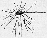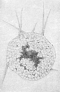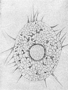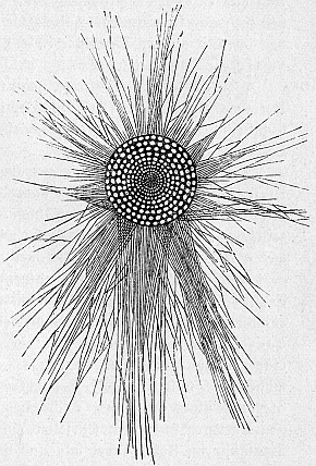 Abb. 4. Orbitolites. Einzelliges Lebewesen, das im roten Meer lebt. Aus der mit Poren versehenen Kalkschale, die die Zelle umgibt, sieht man die Scheinfüßchen herausragen. Schwach vergrößert. Nach Verworn.