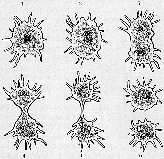 Abb. 9. Amöbe in Teilung. Im Protoplasmaleib der Amöbe sieht man den dunkleren Kern und das pulsierende Bläschen (Vakuole). Man sieht die Scheinfüßchen der Amöbe. 1, 2, 3, 4, 5 und 6 verschiedene Stadien der Teilung. Erklärung siehe im Text. Nach F. E. Schultze.