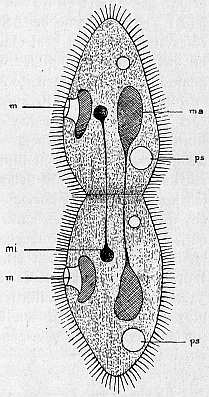 Abb. 10. Pantoffeltierchen in Teilung. m Mund, ps pulsierende Bläschen, ma Großkern, mi Kleinkern. Aus Stridde.