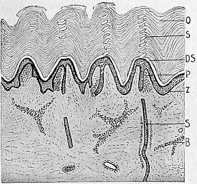 Das vielzellige Tier ist ein Zellenstaat, und in diesem Zellenstaat gehen stets wieder und wieder Zellen zugrunde, die zum Teil vom Körper abgestoßen, abgeworfen werden. In allen Klassen des Tier- und Pflanzenreiches ist das der Fall. Die obersten Schichten unserer Haut z. B. sind abgestorbene verhornte Zellen, die mit der Zeit von unserer Haut losgelöst und abgestoßen werden, während an ihre Stelle von unten her jüngere Zellen vorrücken, und das Schicksal dieser Jungen ist ebenso besiegelt wie das ihrer Vorgänger (Abb. 11 u. 12). Auch unsere Haare und unsere Nägel sind zum großen Teil tote Zellen der Haut. Ebenso die Federn der Vögel. Und wenn die Vögel mausern, so werfen sie schon recht beträchtliche Mengen von toter Zellsubstanz ab, sie werfen Zelleichen ab. So tun es auch zahlreiche Gliederfüßler bei der Häutung. Dieses Sterben einzelner Zellen im Zellverband beginnt schon sehr frühzeitig, indem z. B. schon die Haut des Tieres im Mutterleibe eine Hornschicht und ein Haarkleid besitzt. Und schon im Mutterleibe werden abgestorbene Zellen der Hornschicht und der Haare abgestoßen. Auch von den Schleimhäuten des Mundes und des Darmes werden andauernd Zellen, und sogar intakte Zellen, aus dem Zellverbande gelockert, um dann dem Tode zu verfallen. Unsere roten Blutkörperchen, die roten Blutzellen, die im Laufe ihrer Entwicklung den Zellkern einbüßen und als kernlose Scheiben willenlos vom Blutstrom getragen werden, leben bloß vierzehn Tage, um dann zu zerfallen und als „altes Eisen“ – hier im buchstäblichen Sinne des Wortes – im Haushalt des Zellenstaates[31] Verwendung zu finden. Rote Blutkörperchen, die um vierzehn Tage jünger sind, treten aus dem Knochenmarke, das die Bildungsstätte der roten Blutzellen in unserem Körper ist, an die Stelle ihrer toten Vorgänger. Auch in den Drüsen gehen ständig Zellen zugrunde. Die Geschlechtsdrüsen des Männchens geben periodisch Millionen von lebensfrischen Zellen ab, die winzig kleinen Samenzellen, die alle dem Untergange, dem Tode geweiht sind. Nur einigen wenigen dieser Millionen und Abermillionen von Zellen ist es beschieden, am Leben zu bleiben und in den Kindern fortzuleben. Auch beim Weibe findet periodisch eine Abstoßung von lebendigen Zellen statt, die dem Tode verfallen. Und bei den höheren Tieren ist die Geburt des Kindes damit verknüpft, daß ein Teil des mütterlichen Organismus, der Mutterkuchen, sich vom Körper loslöst und mit all seinen Zellen stirbt.
