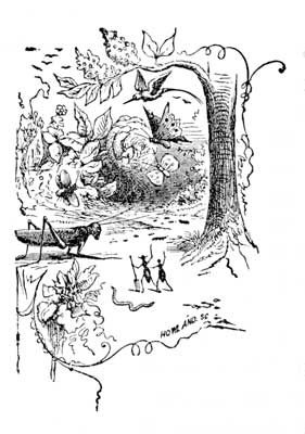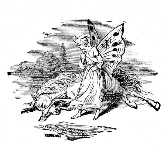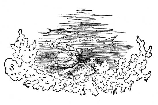 Now, when every thing was so quiet, she began slowly to raise her eyelids a little, until she had her eyes wide open and was staring about her. She seemed to be looking through green glass, and could not see very distinctly, but every once in a while[Pg 22] some dim fish would move beside her; and as her eyes got more used to the place, all things became clearer, and soon she saw that on both sides of her and behind, there was a multitude of fishes of all sizes. They swam beside her, the older and bigger ones moving very sedately, and keeping the same order; but the little frisky fishes would tumble around in great glee, and come darting up to Effie, putting their cold noses up to her face and then go racing back, giggling and whipping their tails about in a fine frolic; and the awkward, bungling, good-natured dolphins, would come tumbling in among the steady fishes and make the greatest commotion, almost upsetting little Effie two or three times, and then go bouncing off, shaking their fat sides with laughter. There was an old sword-fish, that seemed to be a kind of special constable, who kept going round and round, pricking the dolphins whenever he got a chance and frightening the little fishes almost out of their senses; as often as he made his appearance, with that long sword of his sticking out, such a scampering as there would be! and how the wee fishes would[Pg 23] try to hide behind the dolphins, and how the dolphins would slap them with their fins, and go rolling in among the steady fishes, as if they were the most quiet, well-disposed, respectable fishes that ever were. Oh! how they frolicked and tumbled about the little sea-green man with Effie on his back! Effie shouted and clapped her hands in great glee, and tried to hop up and down on the little man's hump, but she was so tied down that she couldn't, so she kept digging her toes into his back, and twitching the bobs of the seal-skin cap, till he got going at a terrible pace, so fast that it was as much as the fishes and dolphins could do to keep up with him, without playing by the way!