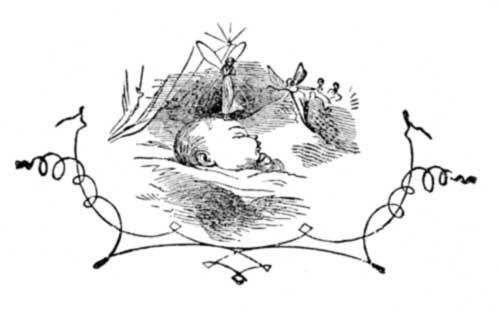 "Here," said Mrs. Gilder, plunging her hand into another of her wonderful apron's pockets and fishing out some tobacco, and then diving into another for matches, filling and lighting her old man's pipe. They looked at the little child lying in her crib, and thought now they would do any thing in the world to make her happy and good. She was fast asleep now, and her little face had become untied—for you know it was[Pg 19] in a knot when she lay down—and now she was smiling in her sleep. Perhaps she was dreaming about the old man with the beautiful voice, and thinking she saw him again.