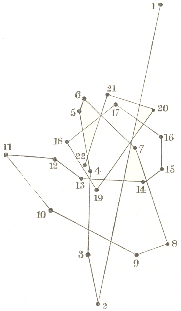 [113] Diagram showing the movement of the upper internode of the common Pea, traced on a hemispherical glass, and transferred to paper; reduced one-half in size (Aug. 1st)