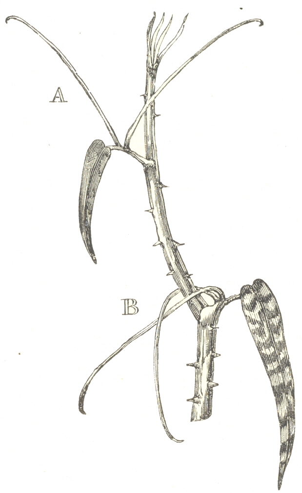 [84] Never having had the opportunity of examining tendrils produced by the modification of branches, I spoke doubtfully about them in this essay when originally published. But since then Fritz Müller has described (Journal of Linn. Soc. vol. ix. p. 344) many striking cases in South Brazil. In speaking of plants which climb by the aid of their branches, more or less modified, he states that the following stages of development can be traced: (1.) Plants supporting themselves simply by their branches stretched out at right angles—for example, Chiococca. (2.) Plants clasping a support with their unmodified branches, as with Securidaca. (3.) Plants climbing by the extremities of their branches which appear like tendrils, as is the case according to Endlicher with Helinus. (4.) Plants with their branches much modified and temporarily converted into tendrils, but which may be again transformed into branches, as with certain Papilionaceous plants. (5.) Plants with their branches forming true tendrils, and used exclusively for climbing—as with Strychnos and Caulotretus. Even the unmodified branches become much thickened when they wind round a support. I may add that Mr. Thwaites sent me from Ceylon a specimen of an Acacia which had climbed up the trunk of a rather large tree, by the aid of tendril-like, curved or convoluted branchlets, arrested in their growth and furnished with sharp recurved hooks.