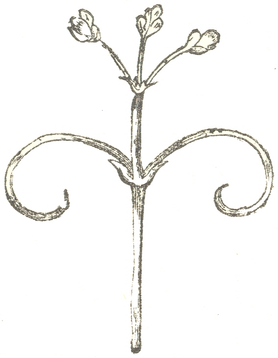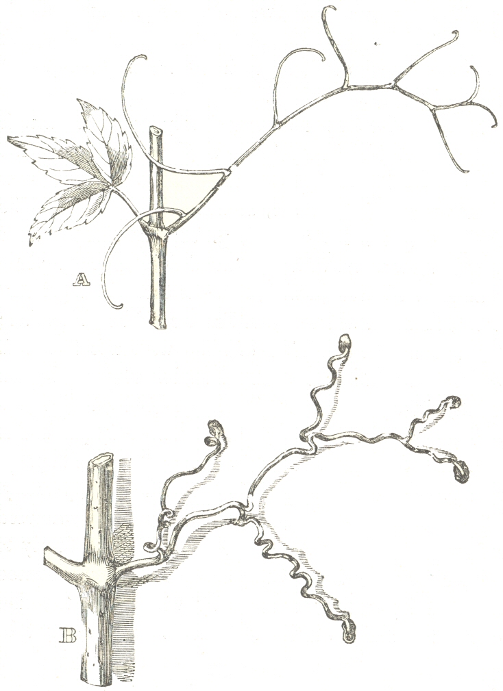 Tendrils of another kind consist of modified flower-peduncles. In this case we likewise have many interesting transitional states. The common Vine (not to mention the Cardiospermum) gives us every possible gradation between a perfectly developed tendril and a flower-peduncle covered with flowers, yet furnished with a branch, forming the flower-tendril. When the latter itself bears a few flowers, as we know sometimes is the case, and still retains the power of clasping a support, we see an early condition of all those tendrils which have been formed by the modification of flower-peduncles.